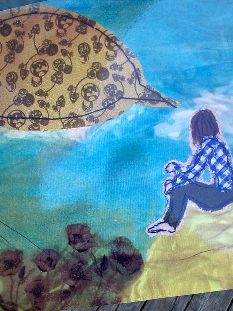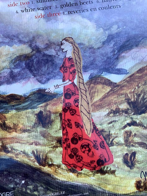 That artwork carried so many threads of my creative life at the time: scans of woven pieces I made in a textiles class at OCAD, a hand-screened repeat pattern on fabric, little hand-sewn figures in plaid, and a painted backdrop of mountains and desert. So when Aimee looked at me and said, “You did this? I really love it, I remember Gayle showing me this!” it was deeply affirming - like my music and my art had converged in the most unexpected way, and had been truly seen by someone I respected and admired.